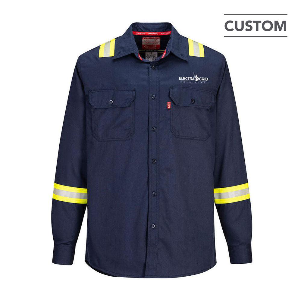 | This stylish shirt is lightweight and comfortable. Ideal for situations where extra visibility is required. 2 chest pockets with button closures for storage. The shirt tail will stay tucked in during movement and all day wear. Shell Fabric: Bizflame 88/12: 88% Cotton, 12% Nylon 7oz |